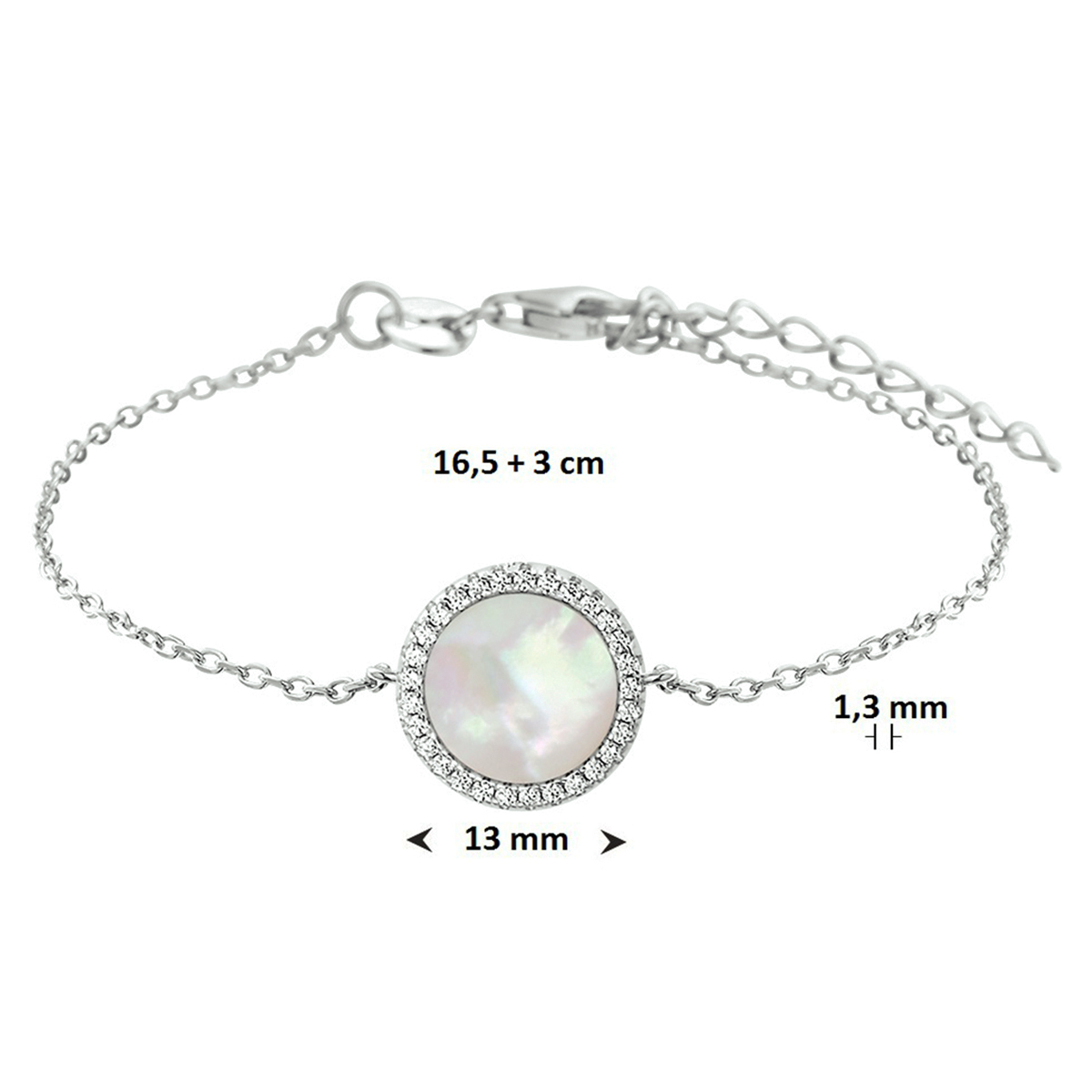 Gerhodineerd 925 zilveren armband met een parelmoer rondje van 13mm en heldere zirkonia. De lengte bedraagt 16.5cm met 3cm extensie en de schakelbreedte bedraagt 1.3mm. De armband is te combineren met bijpassende sieraden uit onze collectie.