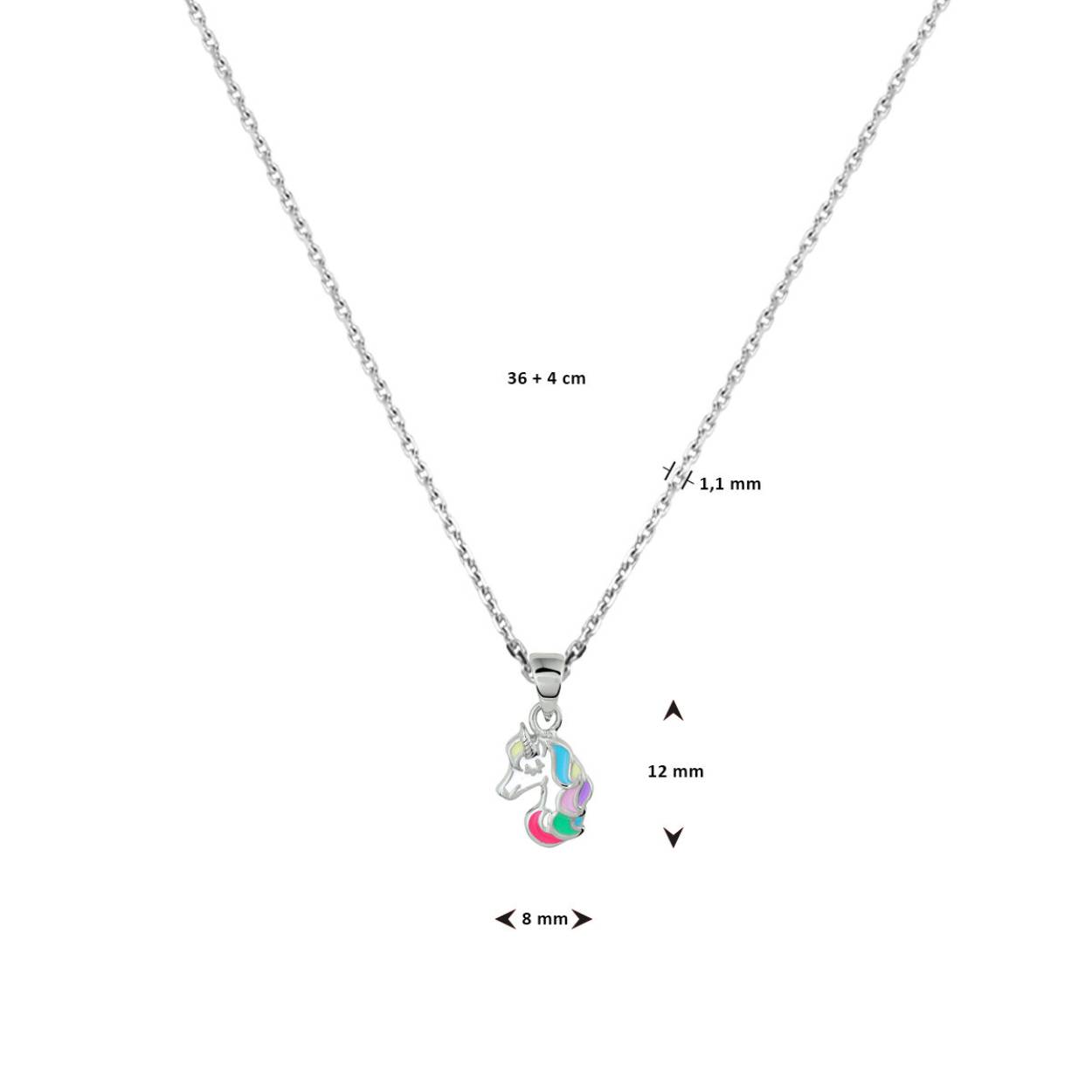 Zilveren collier uitgevoerd met een eenhoorn hanger en een karabijn sluiting. Het collier heeft een draaglengte van 36cm en een extensie van 4cm. De schakelbreedte is 1.1mm.