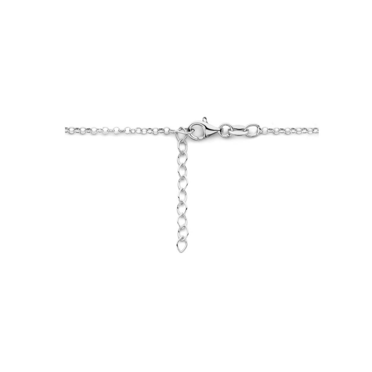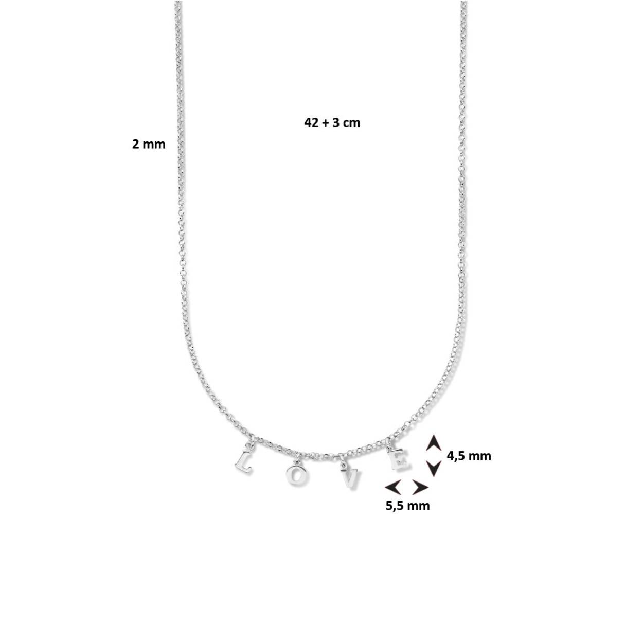 Gerhodineerd 925 zilveren collier uitgevoerd met de tekst 'love' en een karabijn sluiting. Het collier heeft draaglengtes van 42cm met een extensie van 45cm.