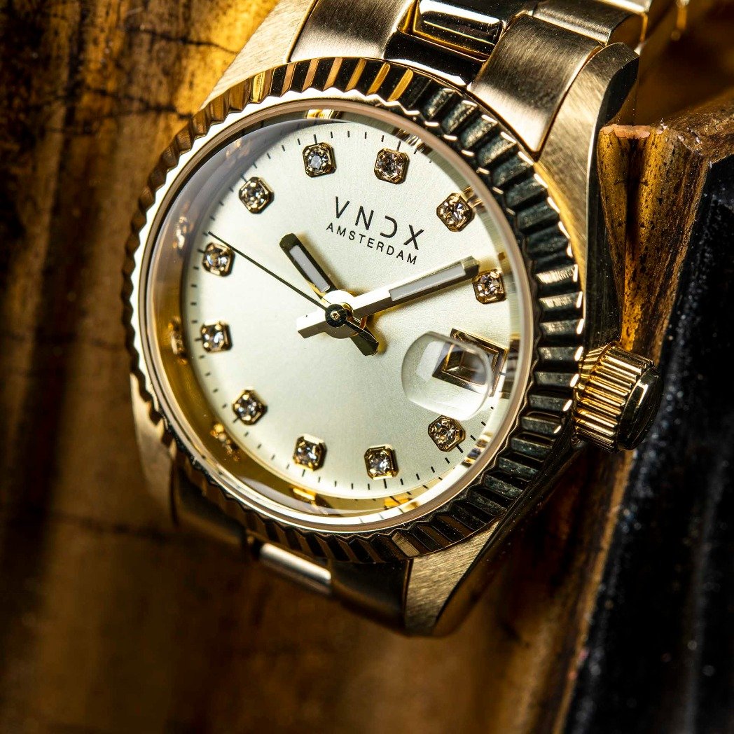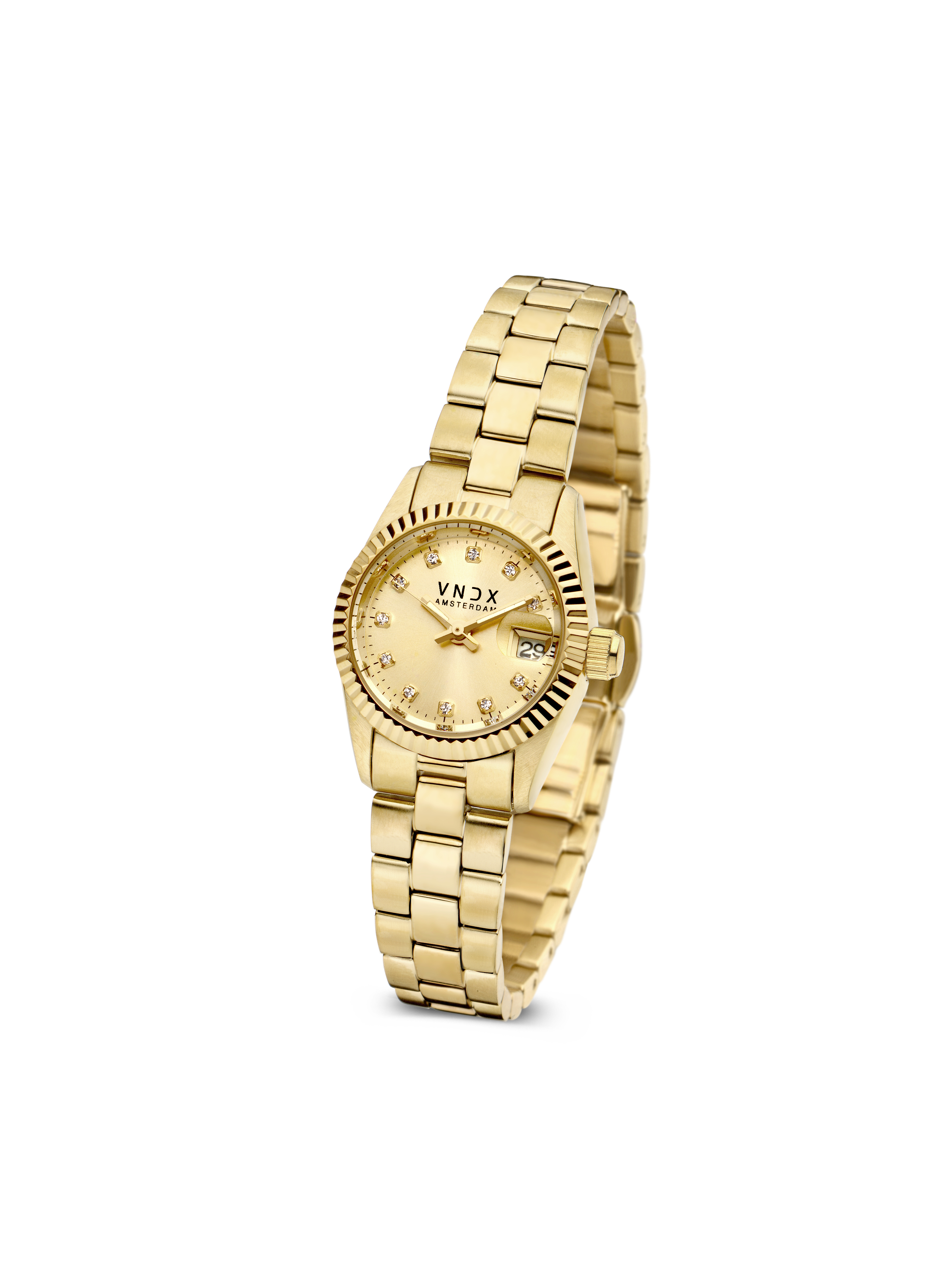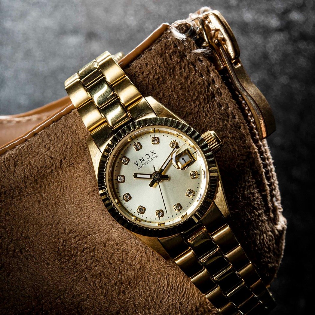 De Dare Devil XS Goud, het meest gedetailleerde horloge van VNDX Amsterdam. Haar subtiele kast van 26 mm maakt haar een perfect accessoire om te combineren met je favoriete sieraden. Haar elegante gouden schakelband zorgt ervoor dat je Dare Devil eenvoudig op maat te maken is.