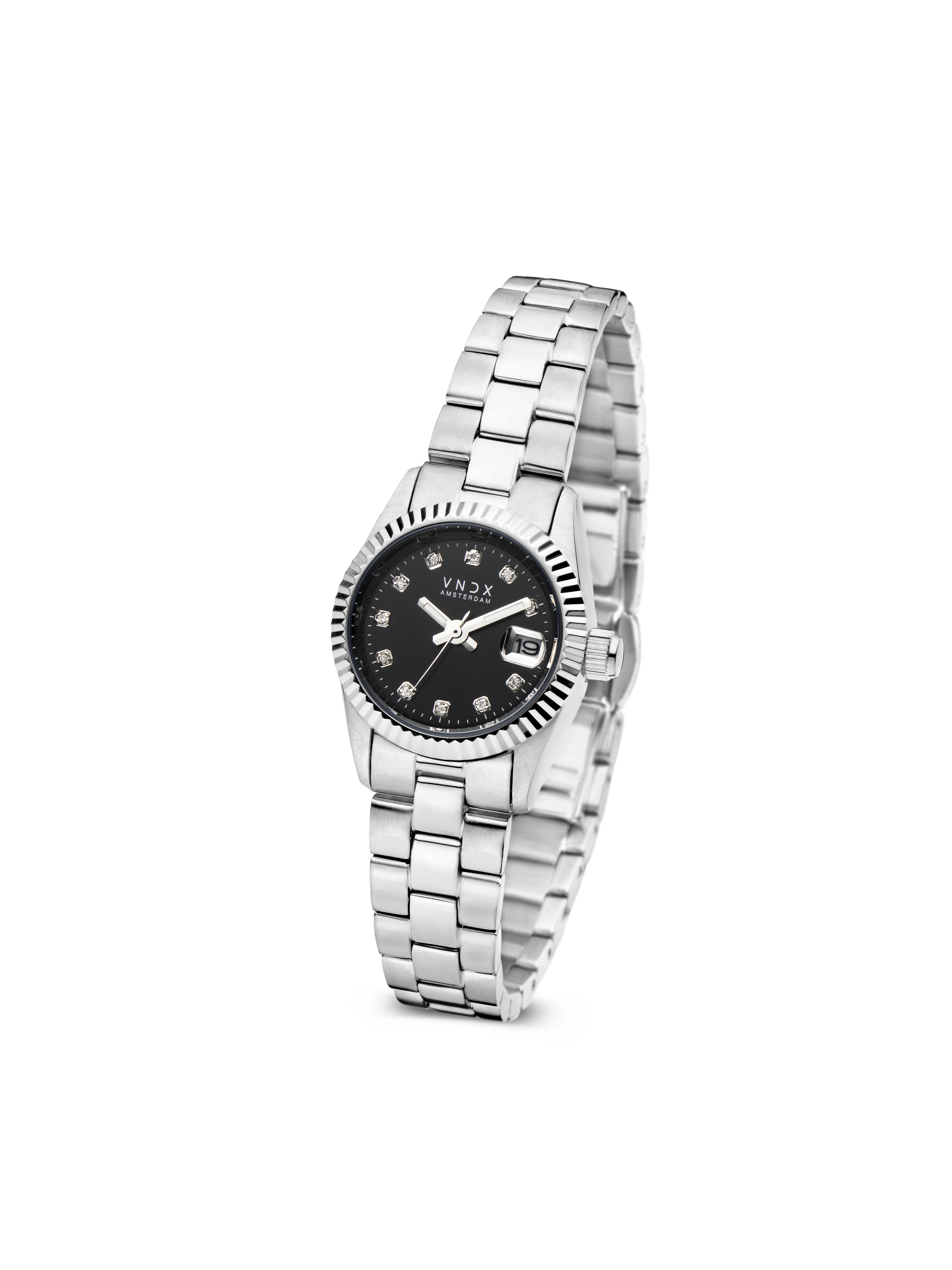 De Dare Devil XS Zilver Zwart, het meest gedetailleerde horloge van VNDX Amsterdam. Haar subtiele kast van 26 mm maakt haar een perfect accessoire om te combineren met je favoriete sieraden. Haar elegante roestvrijstalen schakelband zorgt ervoor dat je Dare Devil eenvoudig op maat te maken is.