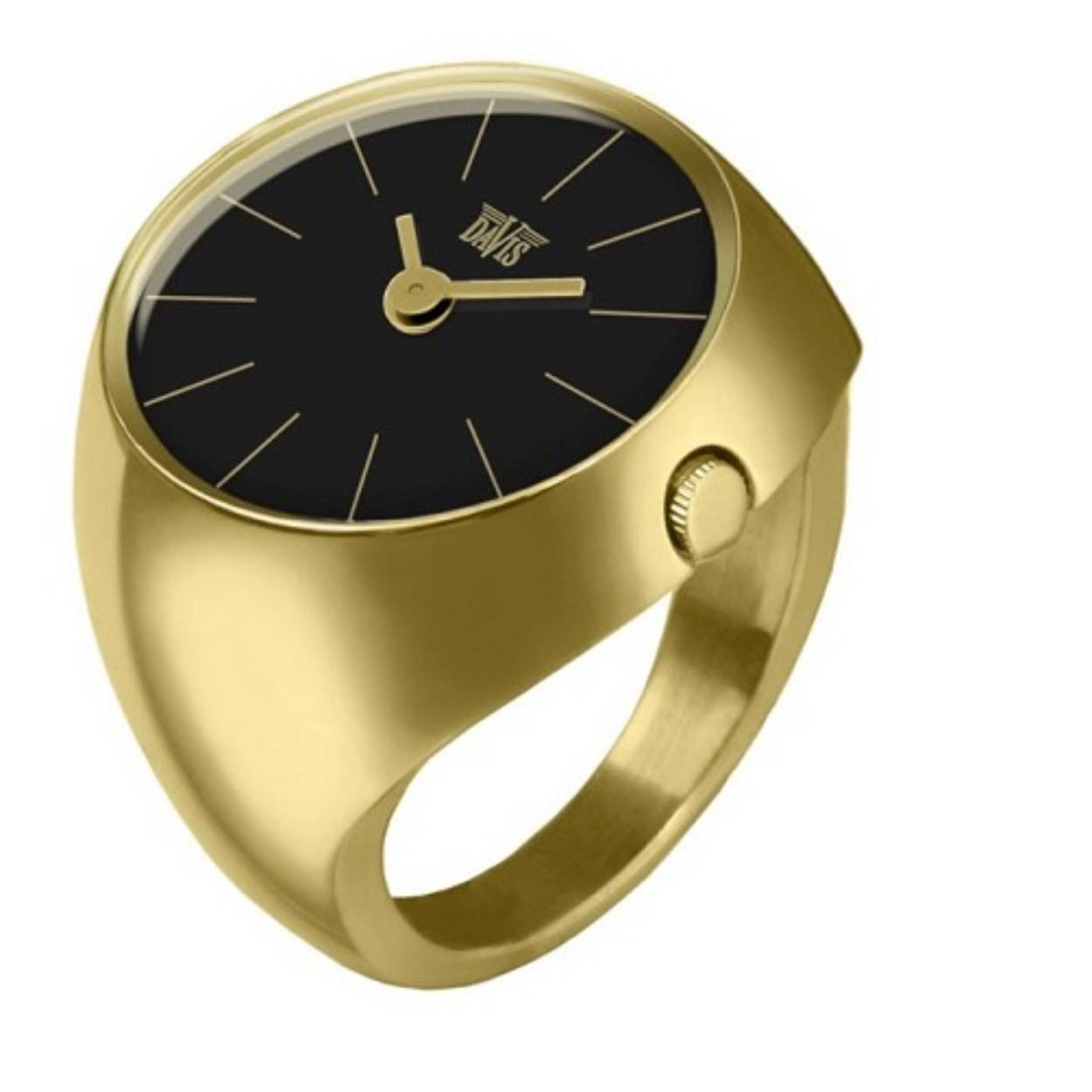 Maya Ring Black ringhorloge voor dames van het merk Davis. De vergulde en zwarte kleur laten een geweldige indruk achter.