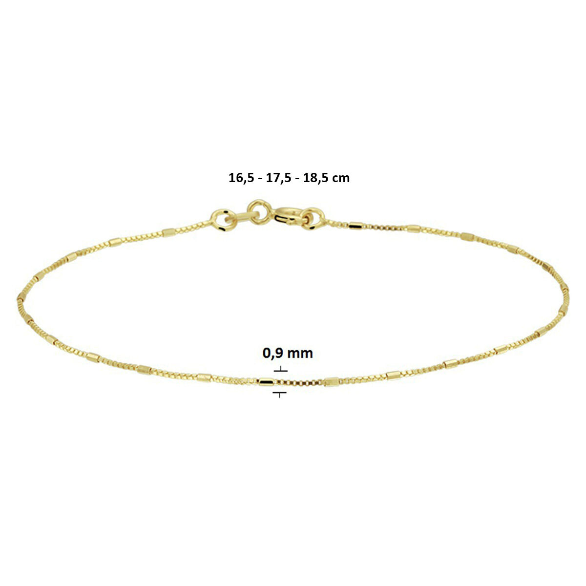 Deze unieke 14k gouden armband combineert minimalistische Venetiaanse schakels met elegante staafjes voor een verfijnde uitstraling. Met een dikte van 0,9 mm is het een subtiel sieraad dat comfortabel draagt. De armband is verstelbaar in lengte (16,5, 17,5 en 18,5 cm) voor de perfecte pasvorm.