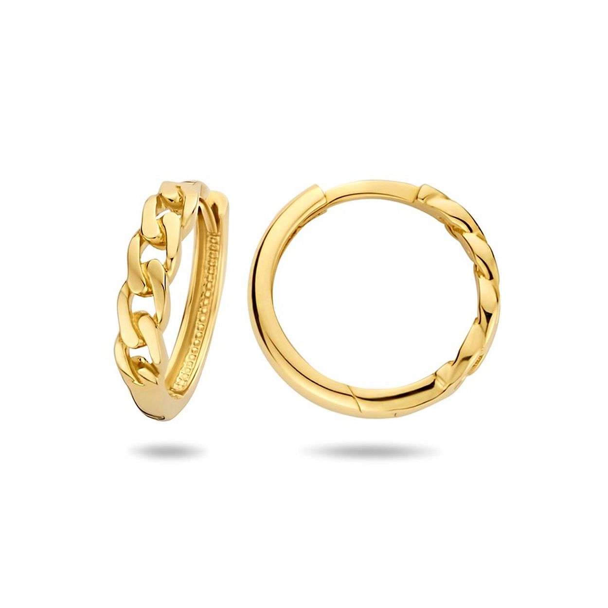 14k Geelgouden klapoorringen uitgevoerd met een schakelmotief. De oorringen hebben een diameter van 14mm en een dikte van 3mm.