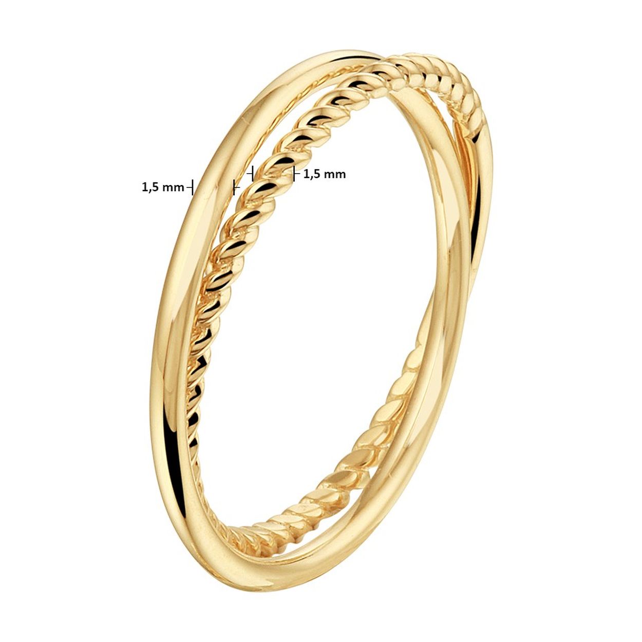 14k Geelgouden ring bestaande uit twee in elkaar gedraaide ringen. Beide ringen hebben een breedte van 1.5mm.