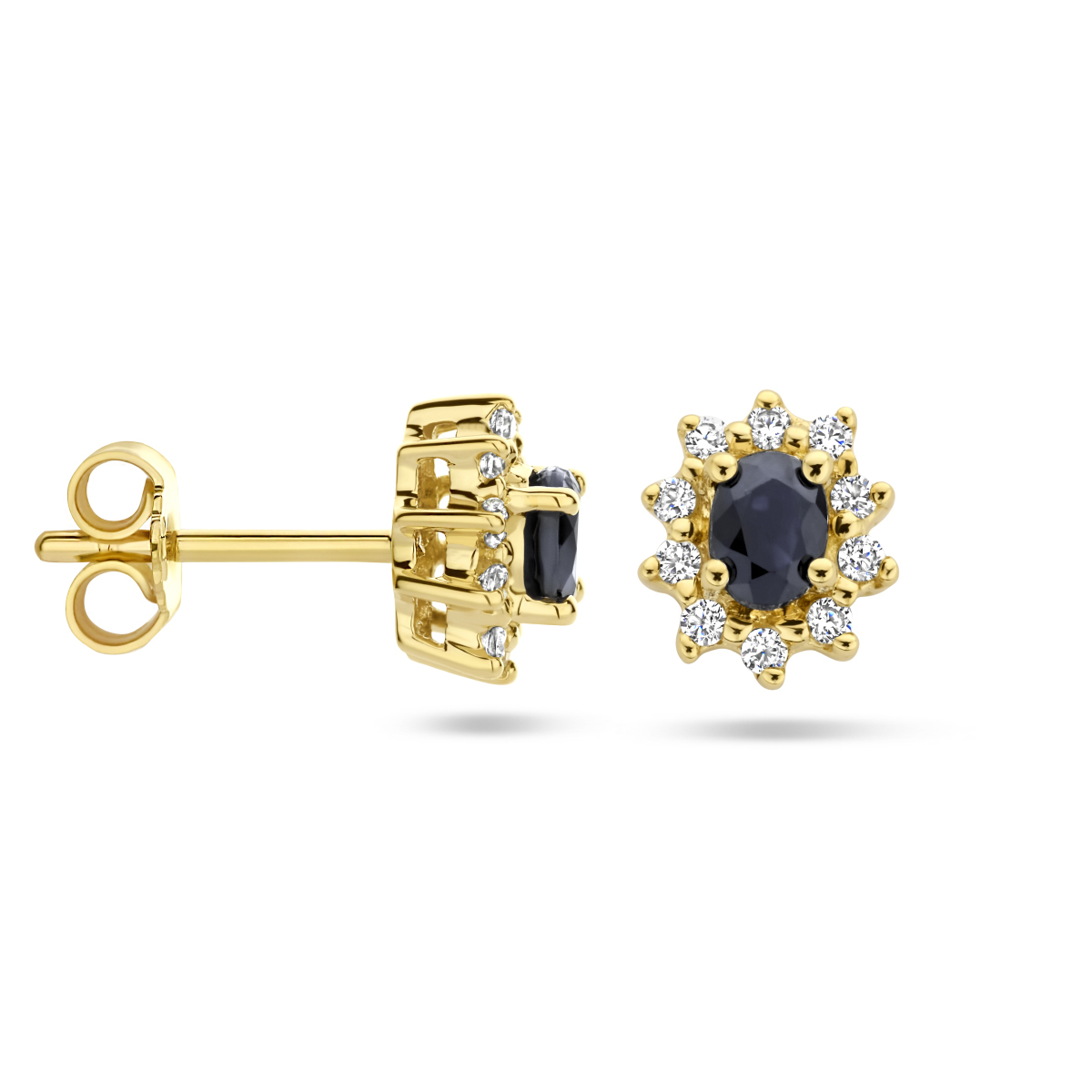 Deze prachtige oorknoppen zijn gemaakt van geelgouden met saffier en diamanten. De oorknoppen zijn onderdeel van een set, zodat u een prachtige set kan samenstellen!