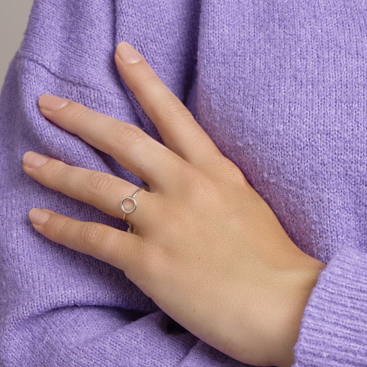 Beschrijving: Gerhodineerd zilveren ring met een open cirkel.