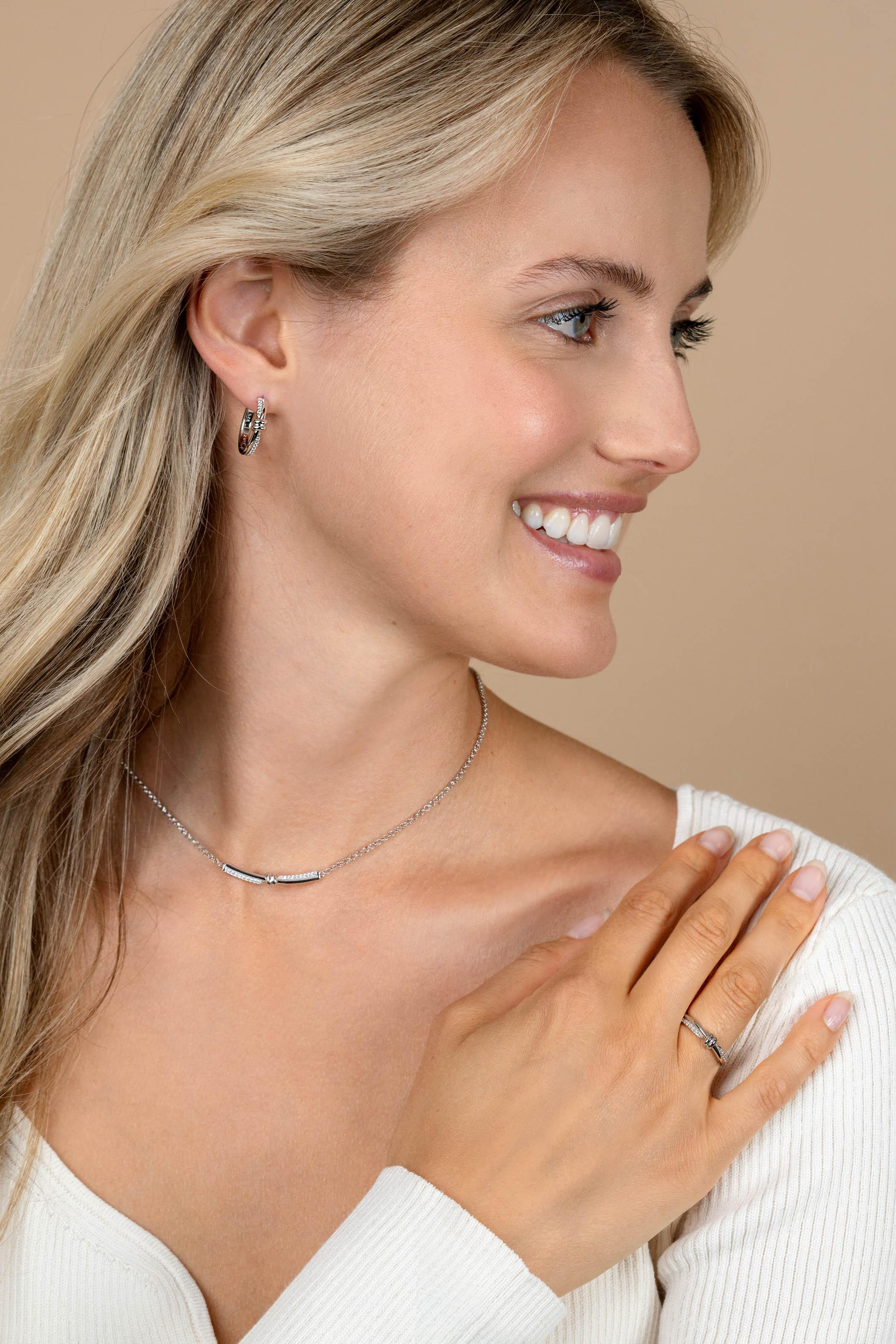 ZINZI zilveren jasseron schakelketting met luxe twist hanger met knoop. Speels bezet met witte zirkonia's. De lengte van de ketting is te variëren tussen de 42cm en 45cm. De ketting is vervaardigd van eerste gehalte zilver (925) en voorzien van een extra rodiumlaag voor een langdurige glans.