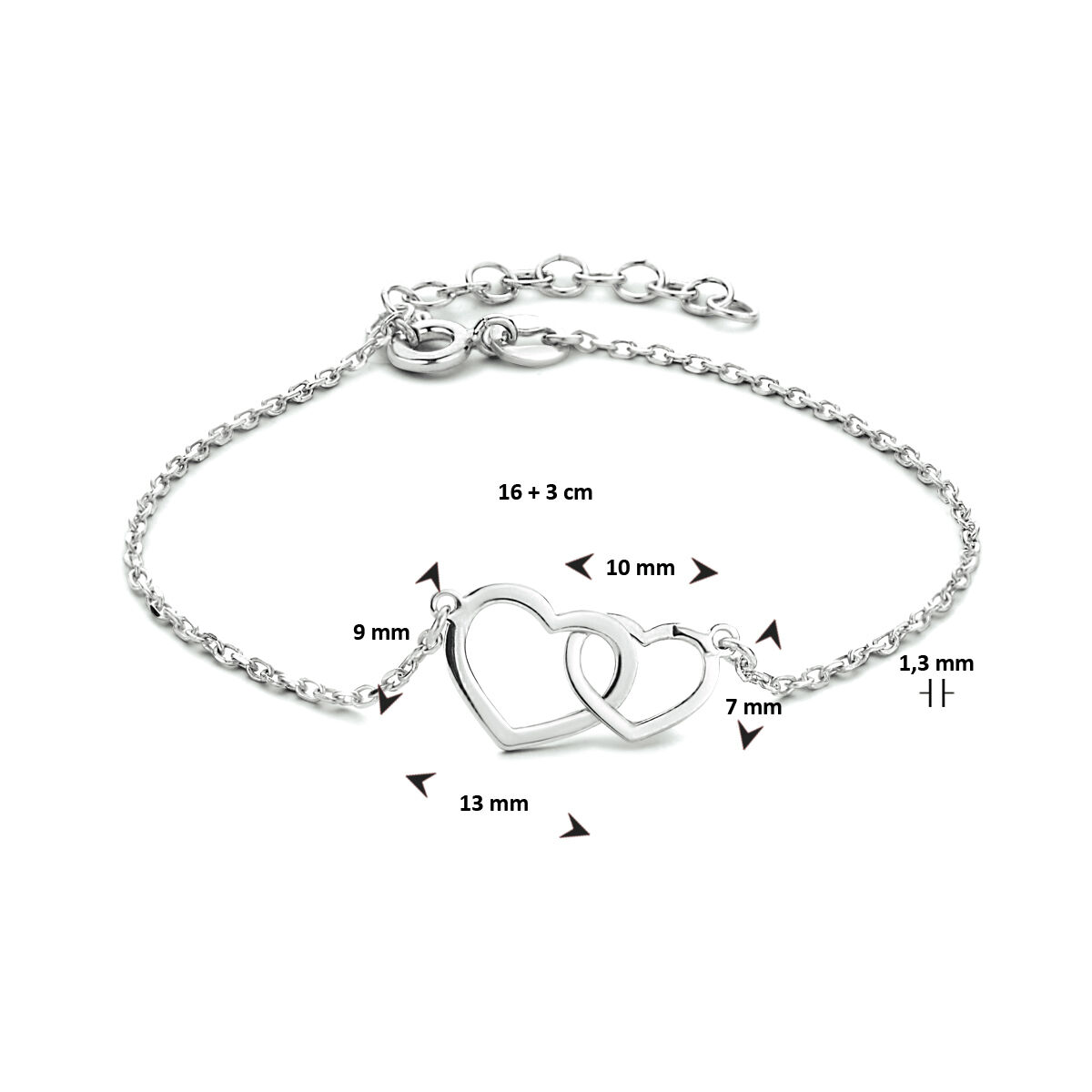 Zilveren armband uitgevoerd met twee hartjes. De armband heeft een draaglengte van 16cm met een extensie van 3cm. De hartjes hebben een afmeting van 7x10mm en 9x13mm. De schakelbreedte is 1.3mm.