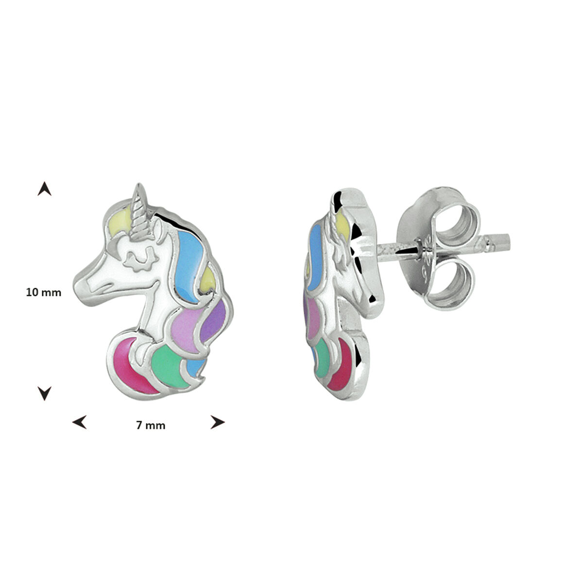 Zilveren oorknoppen in de vorm van een eenhoorn, uitgevoerd met gekleurd emaille. De oorknoppen hebben een afmeting van 10x7mm.