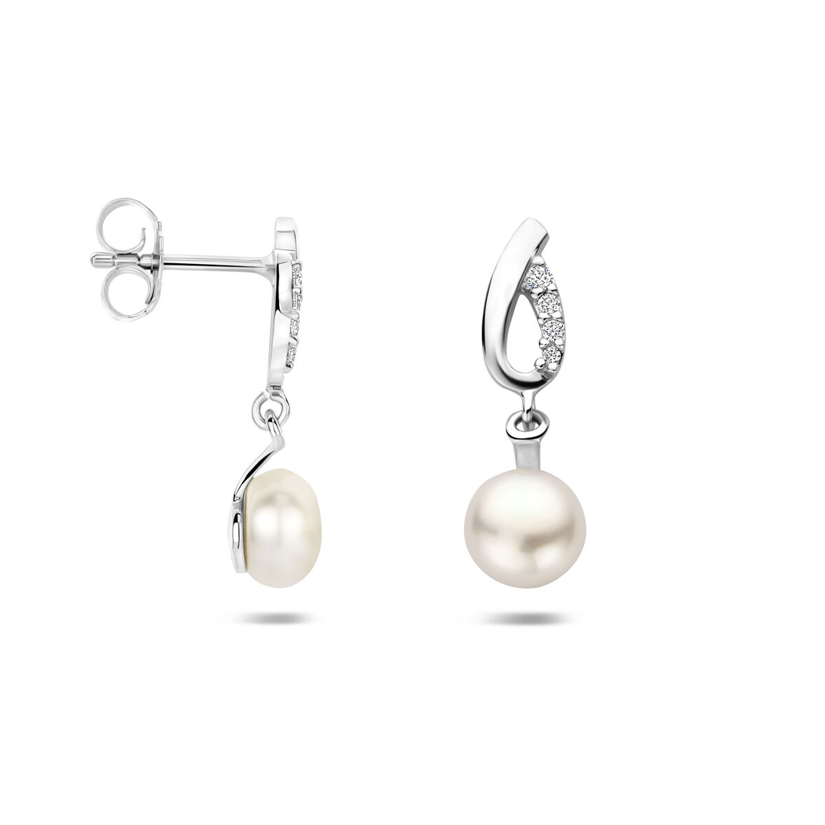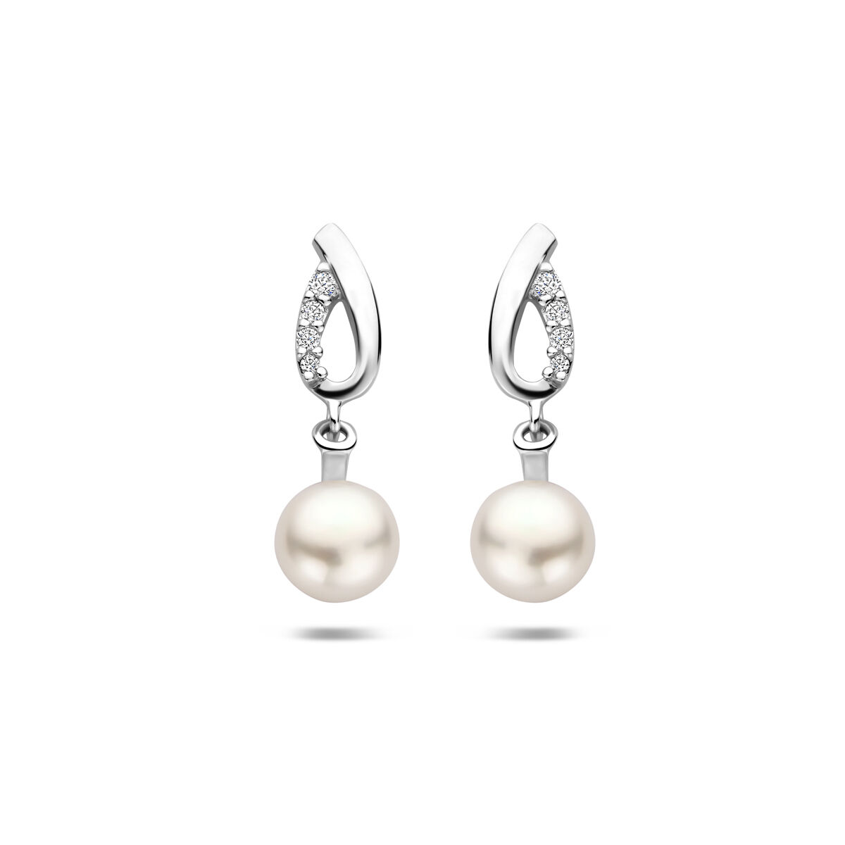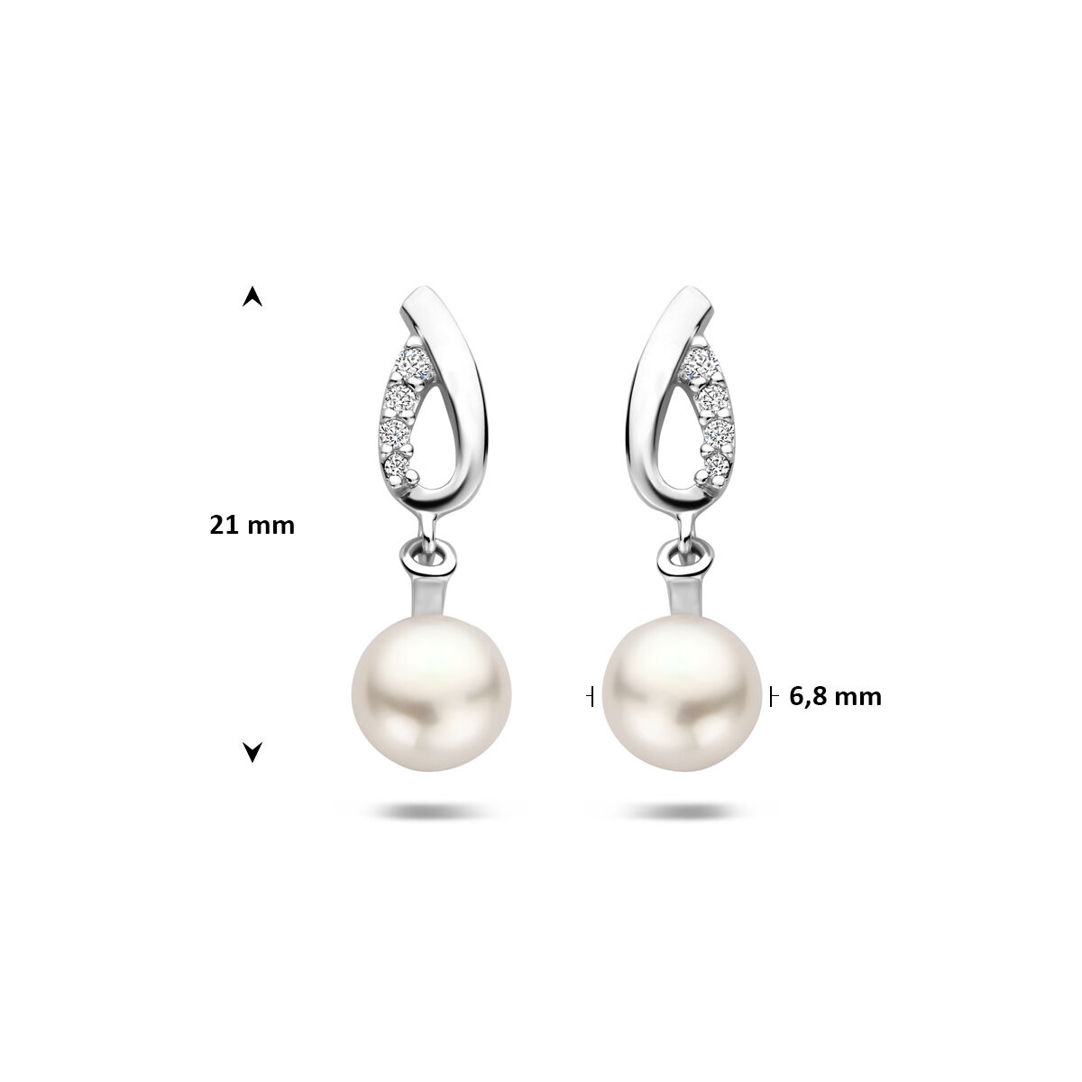 Gerhodineerd zilveren oorhangers met parel en zirkonia. De oorhangers zijn onderdeel van een set.