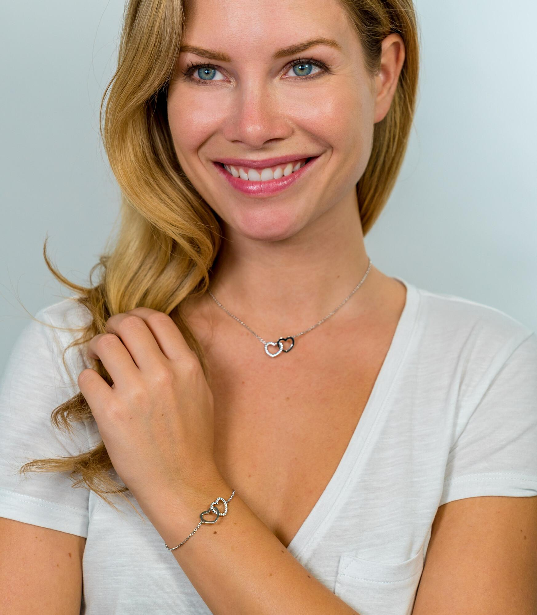 ZINZI zilveren trendy ketting 45cm, waarbij in het midden twee harten mooi met elkaar verbonden zijn: een glad open hartje (11mm) en een open hartje bezet met witte zirconia's. De lengte is te variëren tussen 42 en 45cm. Met herkenbaar Zinzi hartje bij de sluiting. Vervaardigd van eerste gehalte zilver (925) en met extra rodiumlaag voor een langdurige glans.