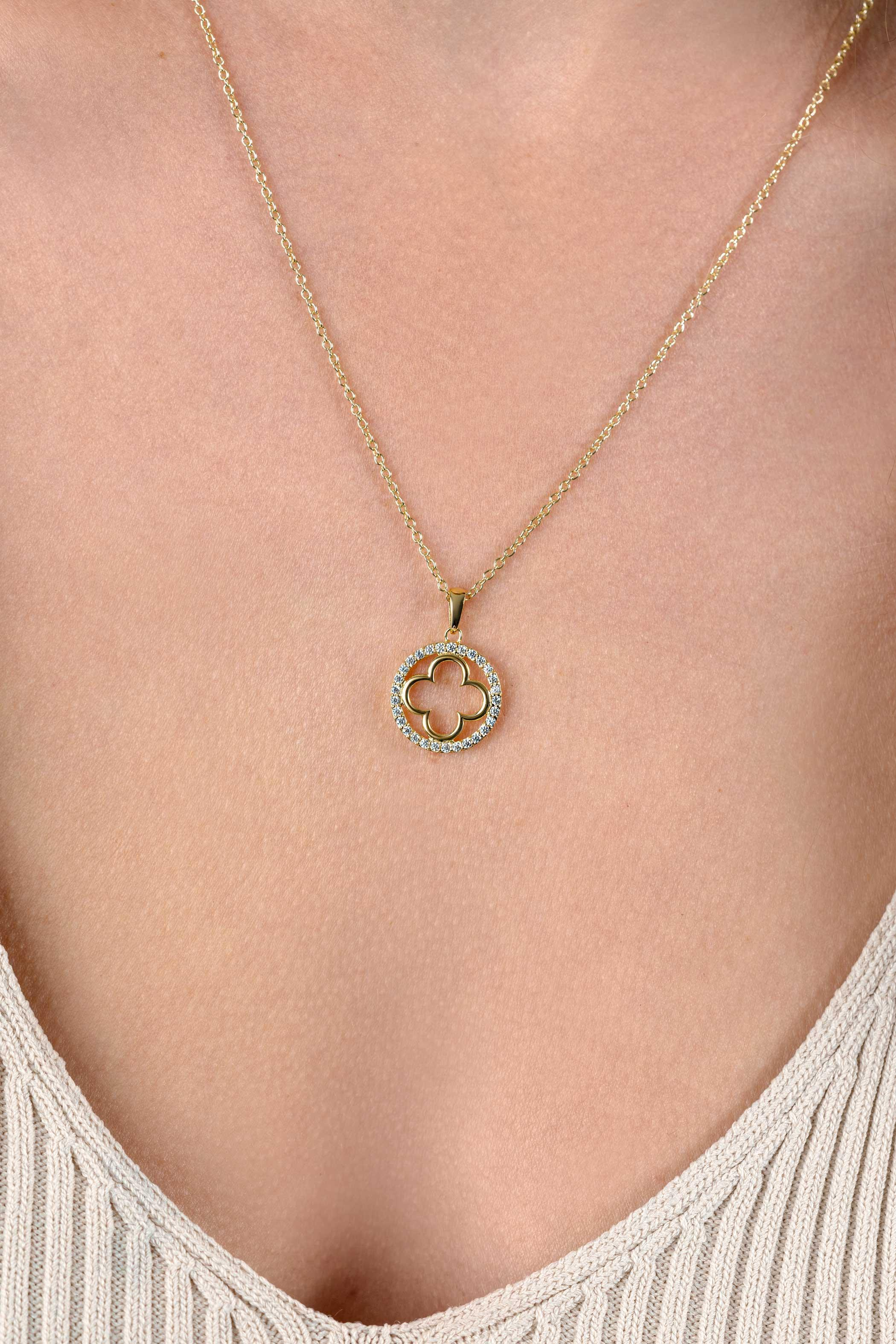 ZINZI gold plated zilveren anker ketting met luxe klaver hanger (15mm) rondom bezet met witte zirconia's. De lengte van de ketting is te variëren tussen 45cm en 48cm. Vervaardigd van eerste gehalte zilver (925) en extra geel verguld.
