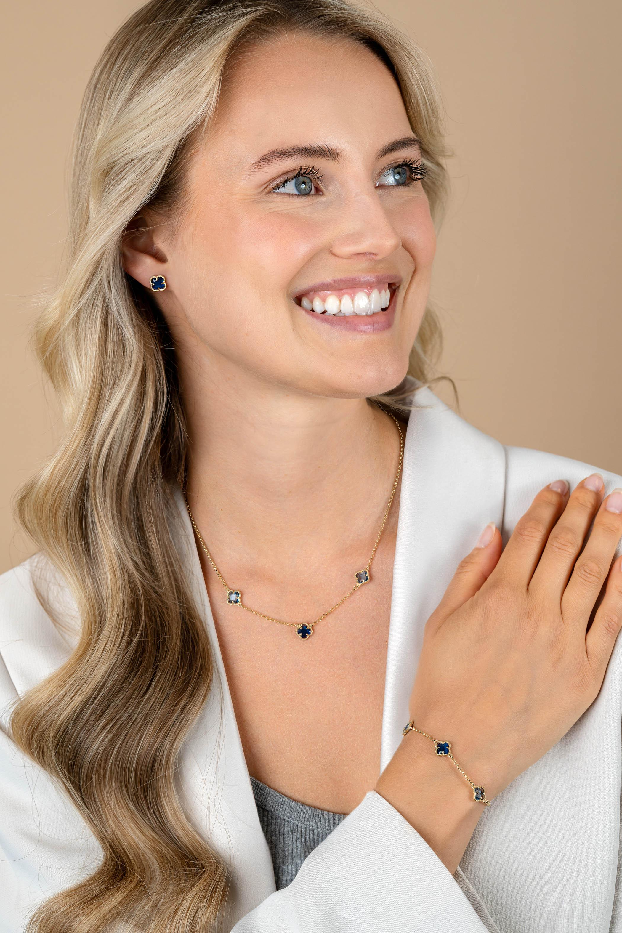 ZINZI gold plated zilveren oorstekers (9mm) in klaver vorm met donkerblauwe kleursteen. Maak je look compleet met de bijpassende armband en ketting! Vervaardig van eerste gehalte zilver (925) en extra geel verguld.