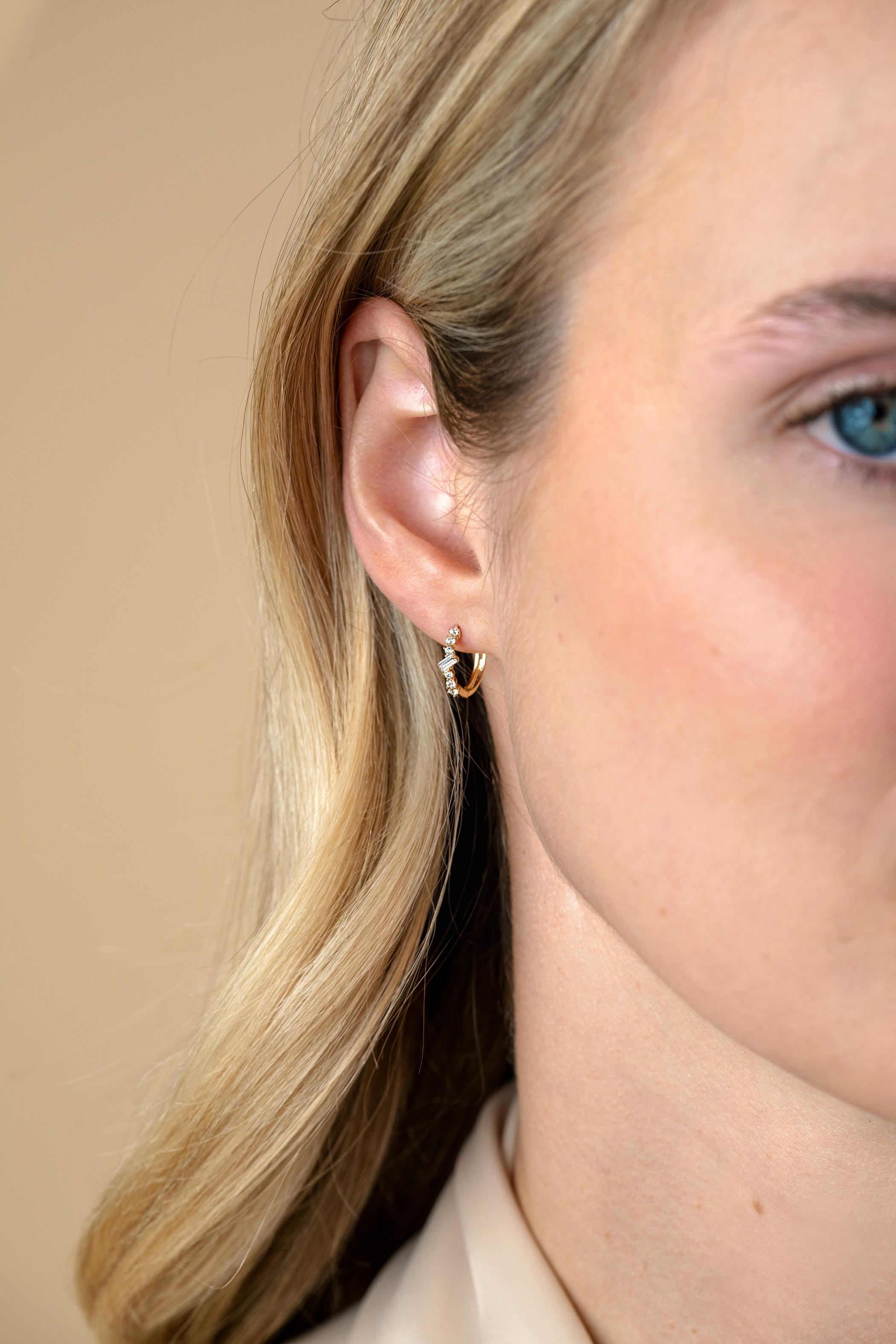 ZINZI Gold 14 karaat gouden oorringen met in het midden een rechthoekig banguette geslepen zirkonia en speels drie ronde witte zirkonia's boven en onder gezet. De ronde zirkonia's verschillen allemaal van grootte, wat een fantasie look geeft aan de oorrringen. Grootte 13mm en een 2mm brede buis. Met een luxe en gemakkelijk klapsluiting. Vervaardigd van geheel 14 karaat goud (585).